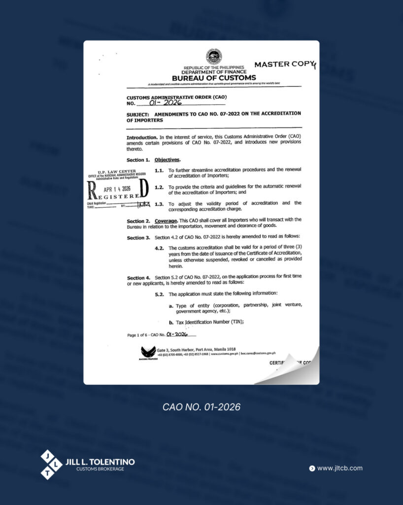 The reform was formalized through Customs Administrative Order (CAO) No. 01-2026, signed by Finance Secretary Frederick D. Go and implemented under BOC Commissioner Ariel F. Nepomuceno. It amends provisions of CAO No. 07-2022, which previously required importers to renew accreditation annually.