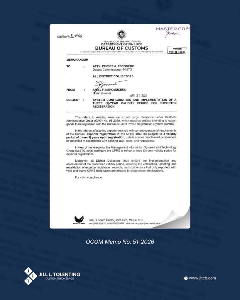 The memo emphasized that the change is intended to align exporter records with current operational requirements. Under CAO No. 08-2020, exporters are required to register with the CPRS before they can process export declarations or secure certificates and proofs of origin.
