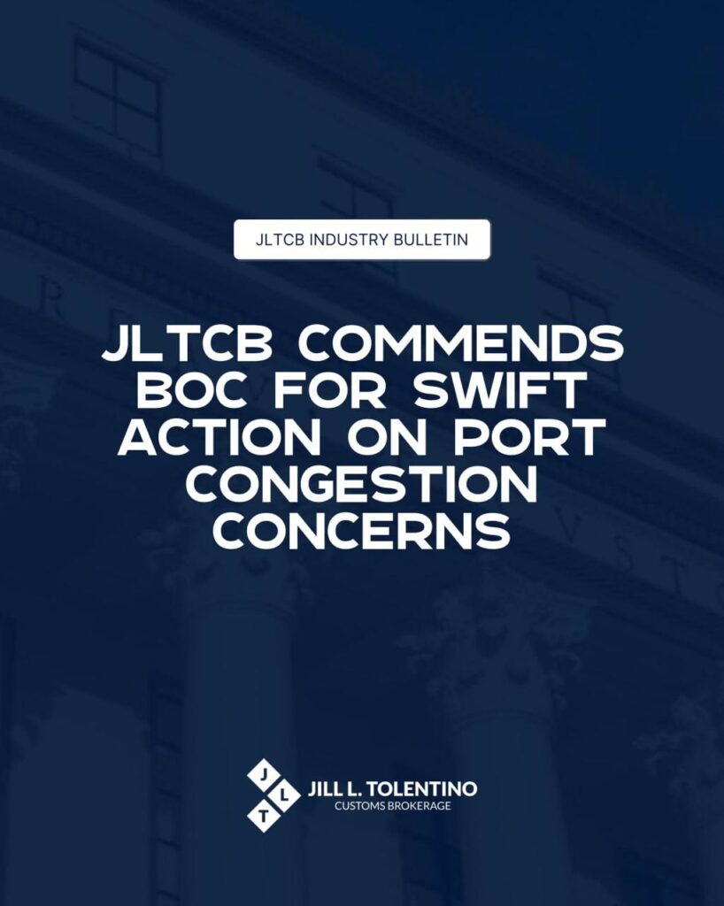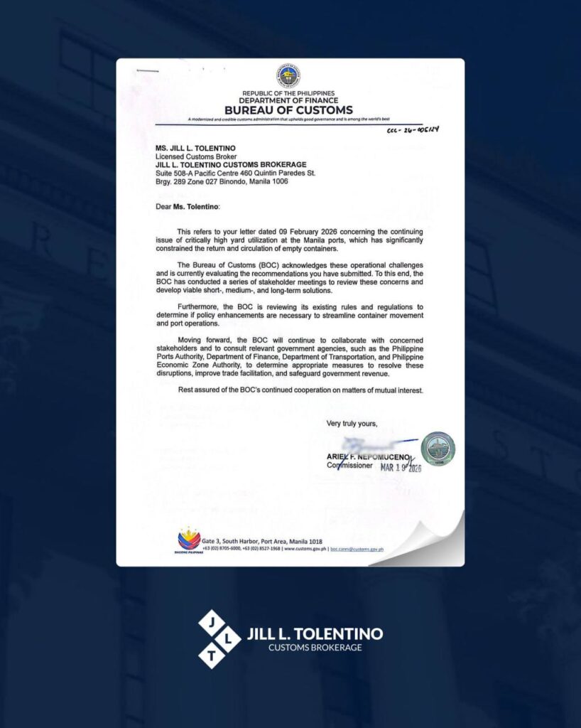 Jill L. Tolentino Customs Brokerage (JLTCB), representing key stakeholders in the port and logistics sector, has formally expressed its appreciation to Bureau of Customs Commissioner Hon. Ariel F. Nepomuceno following the Bureau’s prompt and decisive response to its February 9 letter addressing ongoing port congestion challenges.